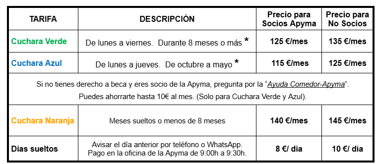 • Esta tarifa exige una permanencia mínima de 8 meses. Si no se cumple este compromiso, se deberá abonar la diferencia entre esta tarifa (sea Cuchara Verde o Azul) y la tarifa Cuchara Naranja (meses sueltos) por cada mes que se utilizó el comedor.